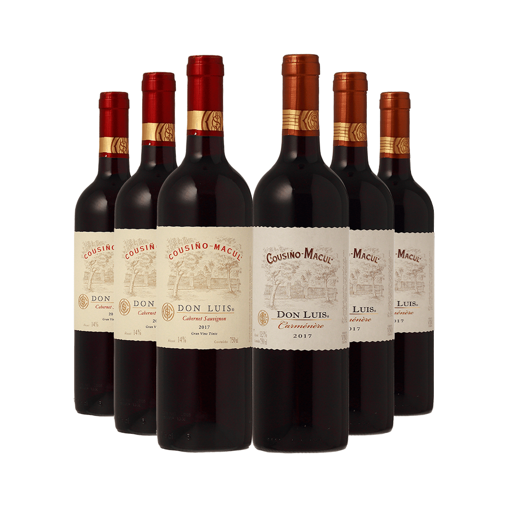 A Caixa Mista Cousiño Macul Don Luis é composta por 3 unidades do Don Luis Cabernet Sauvignon e 3 unidades do Don Luis Carménère. Lindos tintos nascidos no vinhedo! Sem madeira, com mínima intervenção agrícola e provenientes do Valle del Maipo. E ainda assinados pela histórica e prestigiada Cousiño Macul. O Cousiño Macul Don Luis Cabernet Sauvignon tem um estilo mais sério, mas cheio de fruta e frescor. Apresenta aroma de frutas maduras, entre ameixas e amoras, com delicadas e refrescantes nuances herbáceas. Em boca, seus taninos se mostram bem equilibrados com a acidez, proporcionando uma experiência super agradável. E um sedutor toque de chocolate amargo deixa uma deliciosa lembrança. Delicioso! O Cousiño Macul Don Luis Carménère esbanja vivacidade! Com brilhante cor rubi, expressa marcantes aromas de morangos maduros, frutas secas e especiarias, com um toque de pimenta preta. Equilibrando em boca, com uma acidez vibrante que marca este tinto! Deliciosa persistência. Um Carménère que pede comida e a próxima taça. Super versátil!