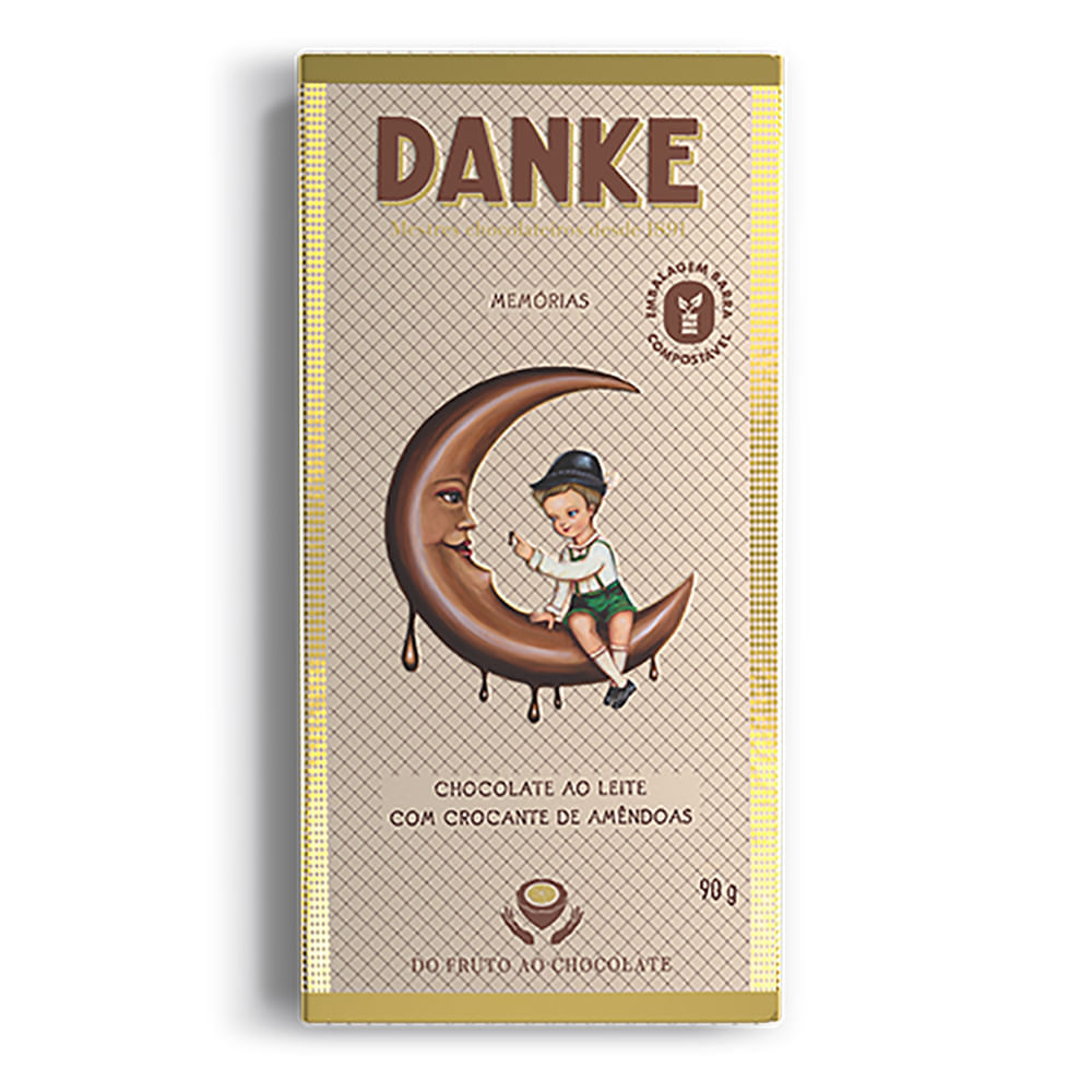 É neste sistema que a marca produz o Chocolate ao Leite Com Crocante de Amêndoas. Um chocolate que derrete na boca e que tem pedacinhos de amêndoas caramelizadas e crocantes, um toque irresistível. Em sua receita, a Danke utiliza chocolate ao leite (açúcar, manteiga de cacau, leite integral em pó, massa de cacau, leite desnatado em pó, emulsificante lecitina de soja e aromatizante), crocante de amêndoas (açúcar, amêndoas, umectante sorbitol e bicarbonato de sódio).