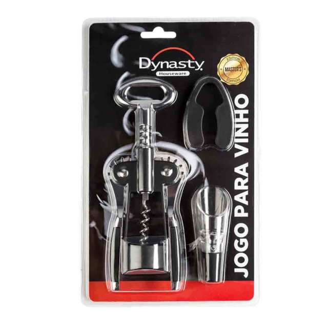 O kit é composto por 1 cortador de lacre, 1 abridor saca-rolhas de agulha a vácuo para garrafas de diâmetro de 17,5 a 20mm; e 1 dosador e aerador de vinho para garrafas com bocal de 18 a 19mm. Os materiais são produzidos em acrílico, inox, silicone, ABS e alumínio. É recomendado lavar as peças após o uso em água corrente.