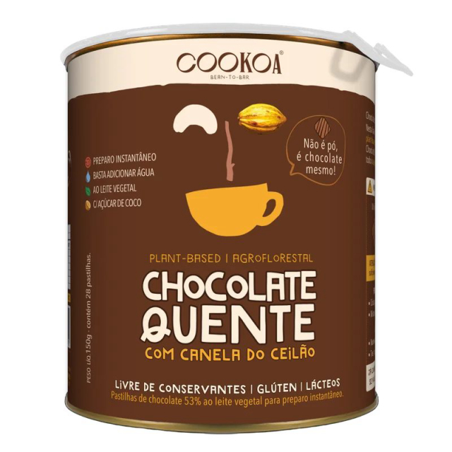 A lata de chocolate quente comporta 150 gramas de pastilhas de chocolate 53% ao leite vegetal, com açúcar de coco e canela do Ceilão. São 28 pastilhas por lata. Para um chocolate quente perfeito, basta adicionar 100 ml de água quente para cada 4 pastilhas, mistura e está pronto para beber.